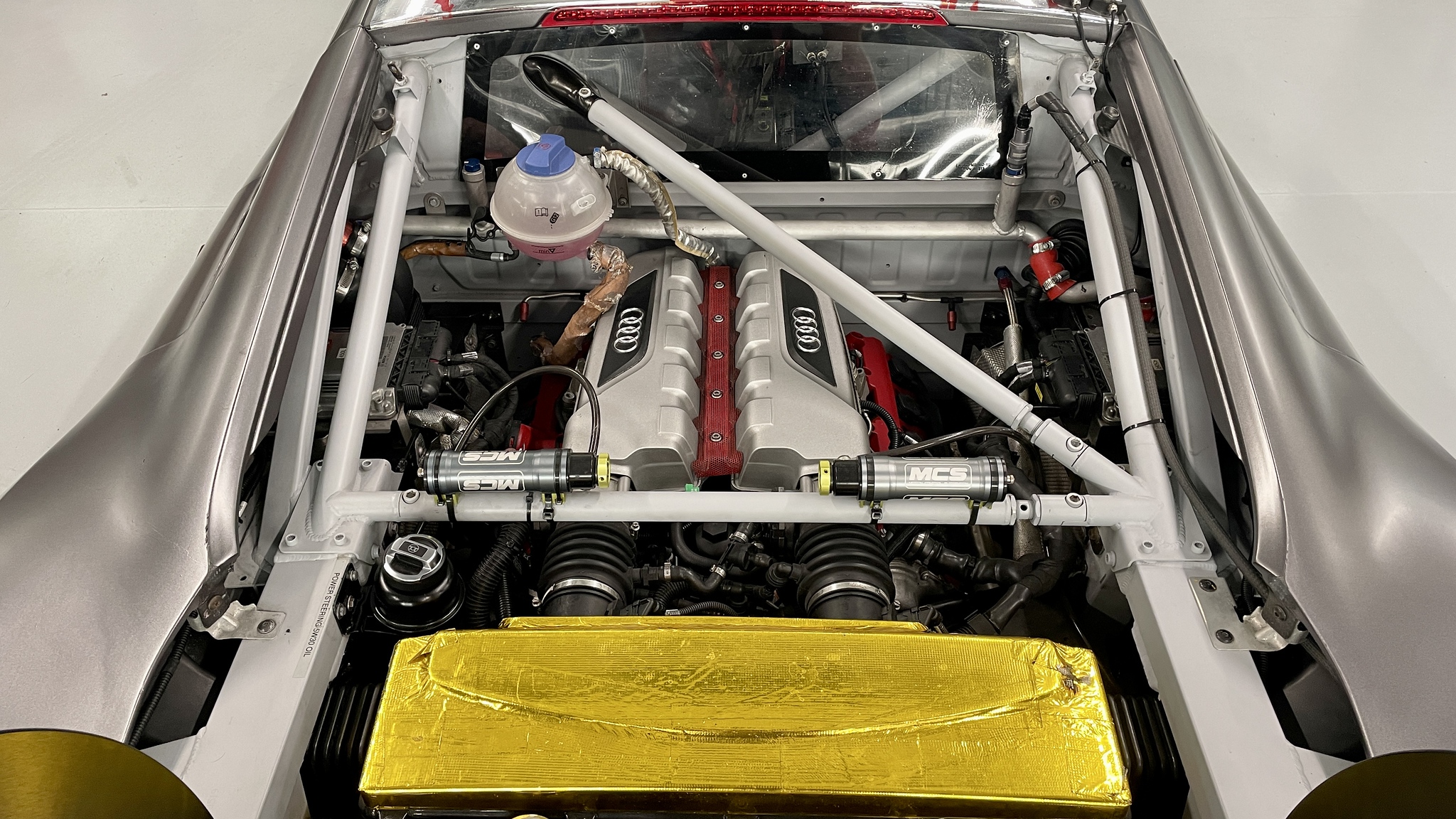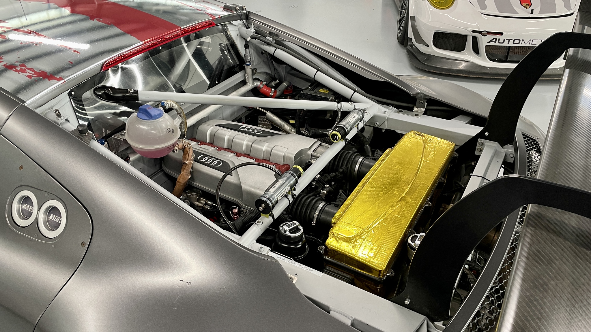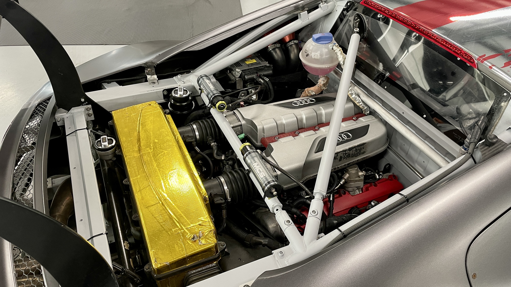 Aluminum Audi space frame with bolted steel roll cage, carbon-fiber composite and aluminum bodywork.